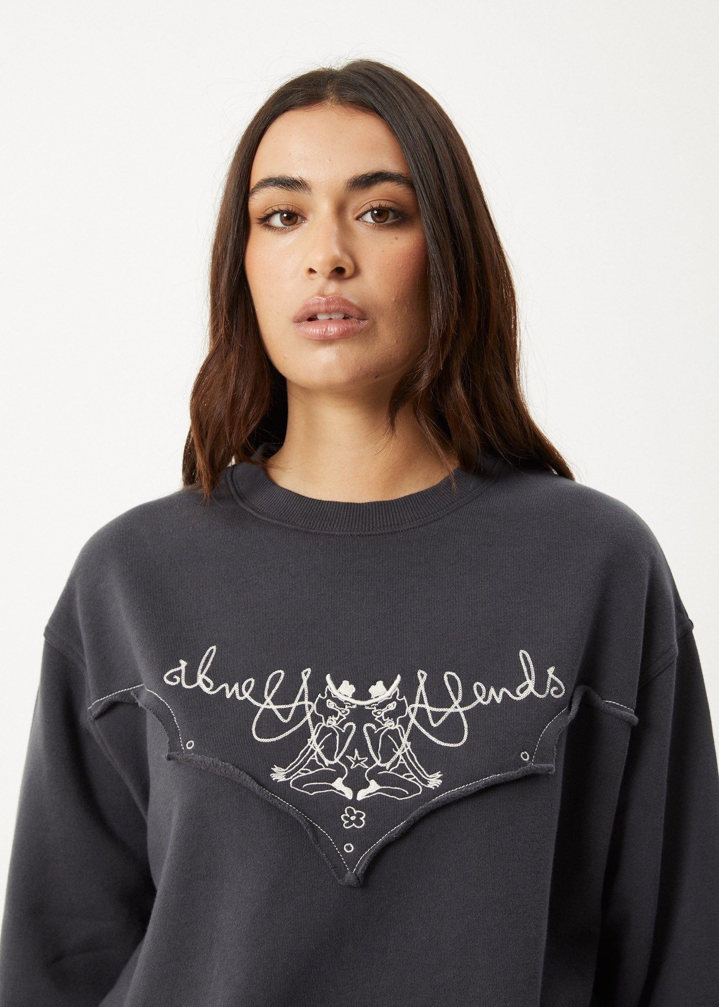 Karlee Mackie, a professional free surfer turned artist, brings her dynamic and fun style to our season. We're embracing an ongoing coastal cowgirl theme - a fusion of our laid-back AFENDS coastal streetwear roots with western cowgirl aesthetics. This crew neck jumper is designed with a slightly cropped, oversized fit, a ribbed neckline, elasticated cuffs, and a raw-edge western yoke with embroidered artwork. Made from a recycled cotton blend brushed dry fleece.